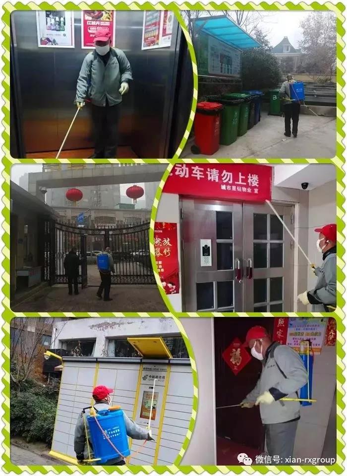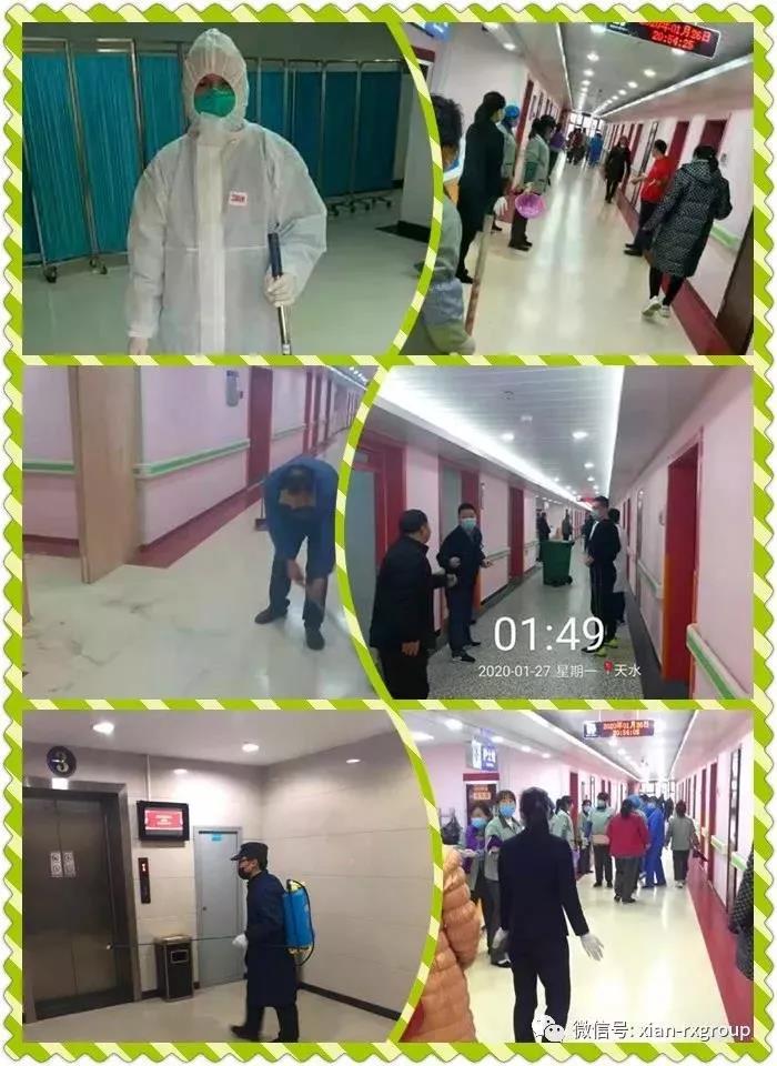 在管的西京医院项目、陕西省第五人民医院项目、天水第一人民医院项目、榆林一院、临潼疗养院项目部均全员上岗,加班打扫医院和科室卫生,为在一线的作战医护人员及出入医院的病患提供干净清洁的卫生环境,保障他们的工作、就医环境。其中临潼疗养院项目部中,有两层楼居住着来自武汉的疗养员,项目部员工临危不惧、负重前行,坚持每天为他们打扫、消毒,保证疗养环境和人员健康。各住宅项目积极响应政府号召,在小区大门口检查体温,小区内张贴预防病毒的温馨提示,挨家挨户进行入户排查、填表登记、上报相关部门,对公共设施如:电梯、走廊、门把手、垃圾台、快递柜等重点部位坚持每天用消毒液定时消毒。其他各项目部也都组织了值班人员对全部区域卫生进行打扫消毒。